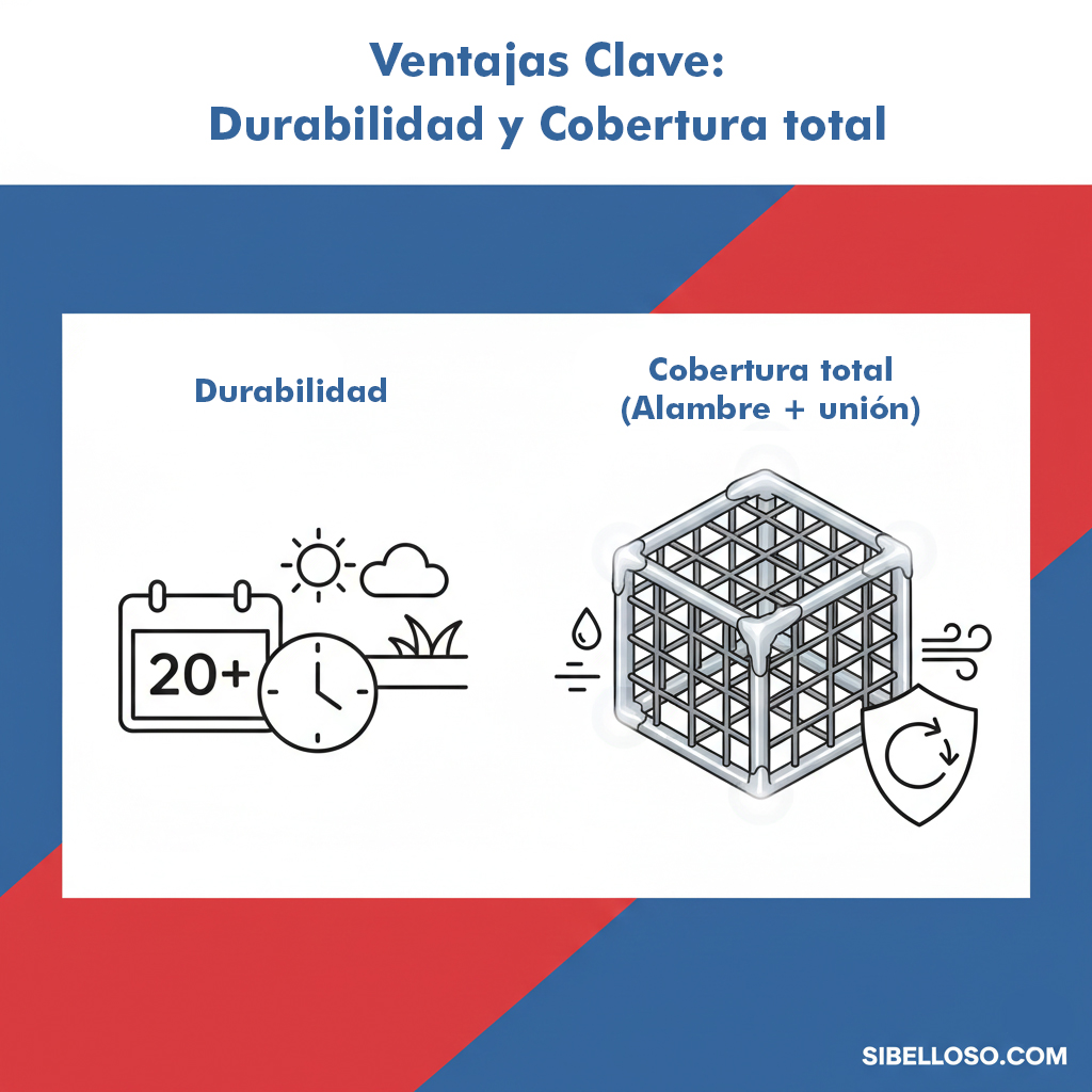 En condiciones normales, una malla o alambre galvanizado correctamente fabricado y bien manipulado puede tener una vida útil muy larga, incluso en exteriores exigentes.